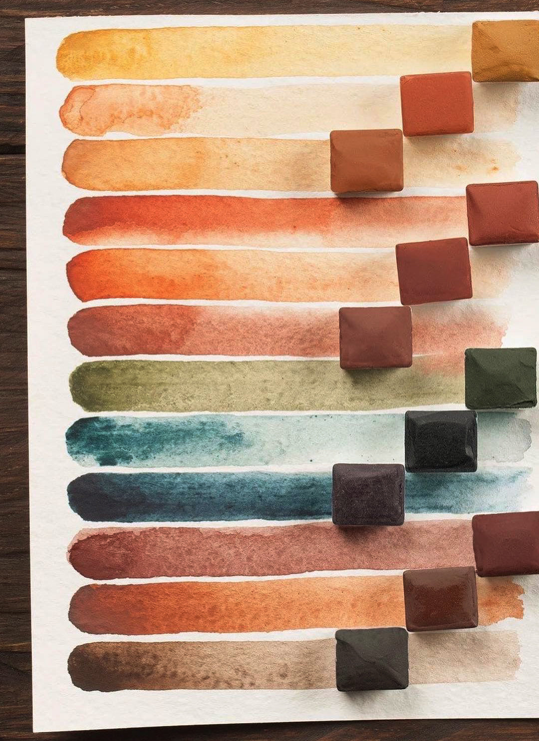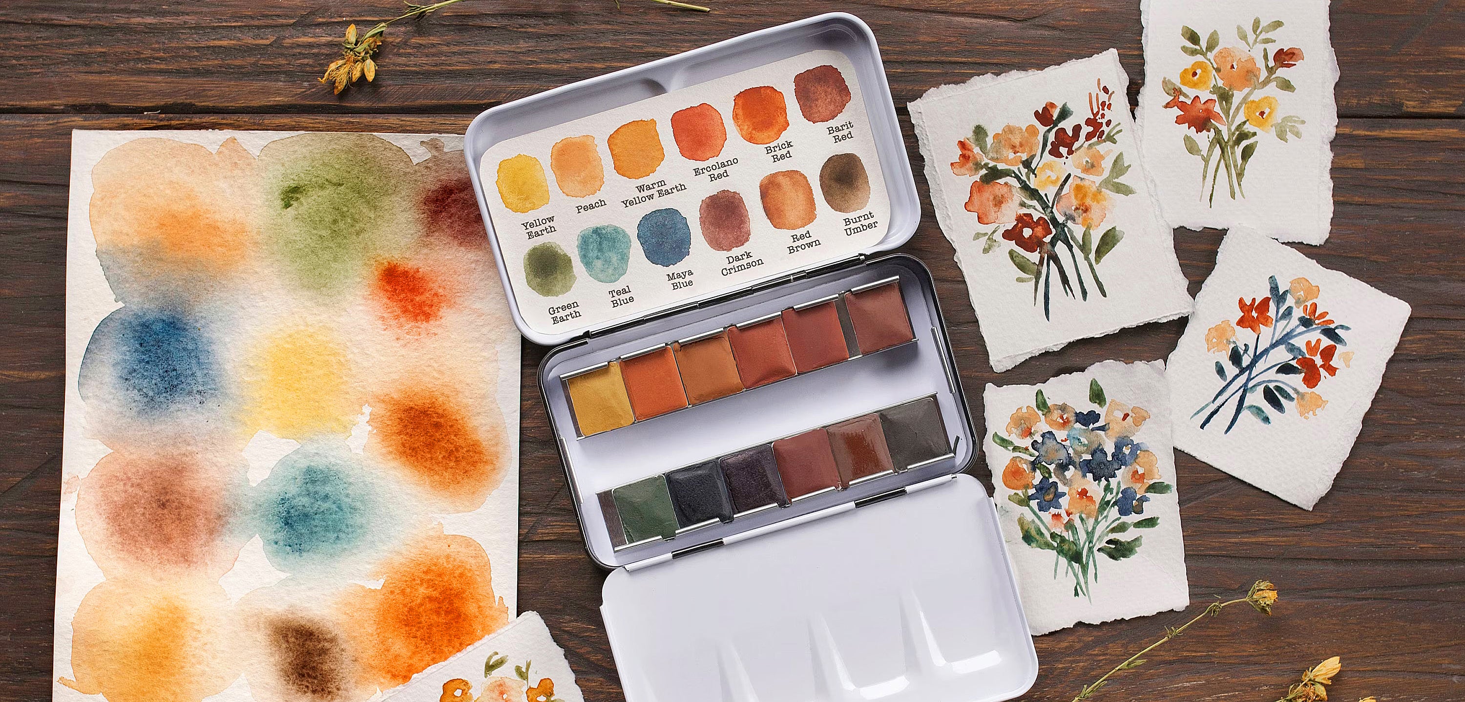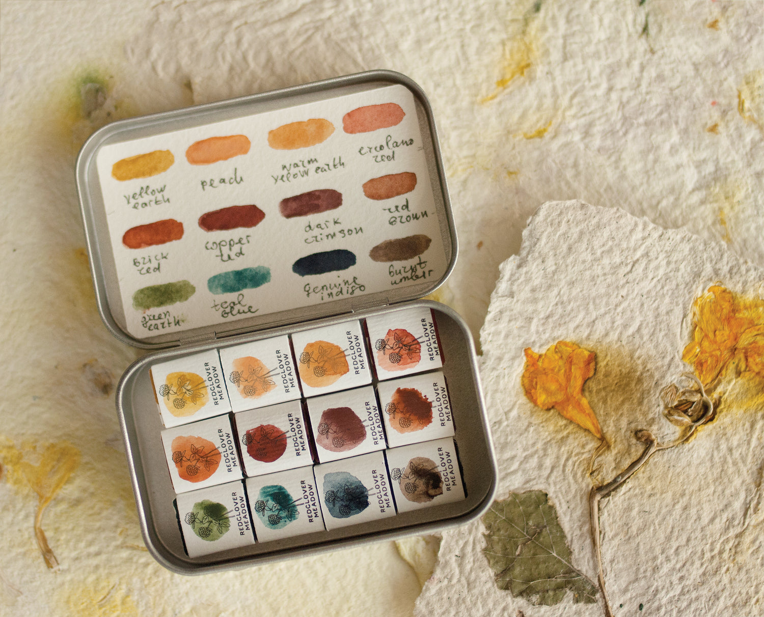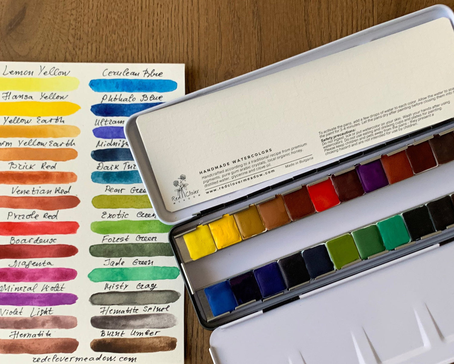 An inspiring collection of 24 artisan handmade watercolor half pans in a professional tin. Includes colors from earth pigments, primary colors and artisan colors.