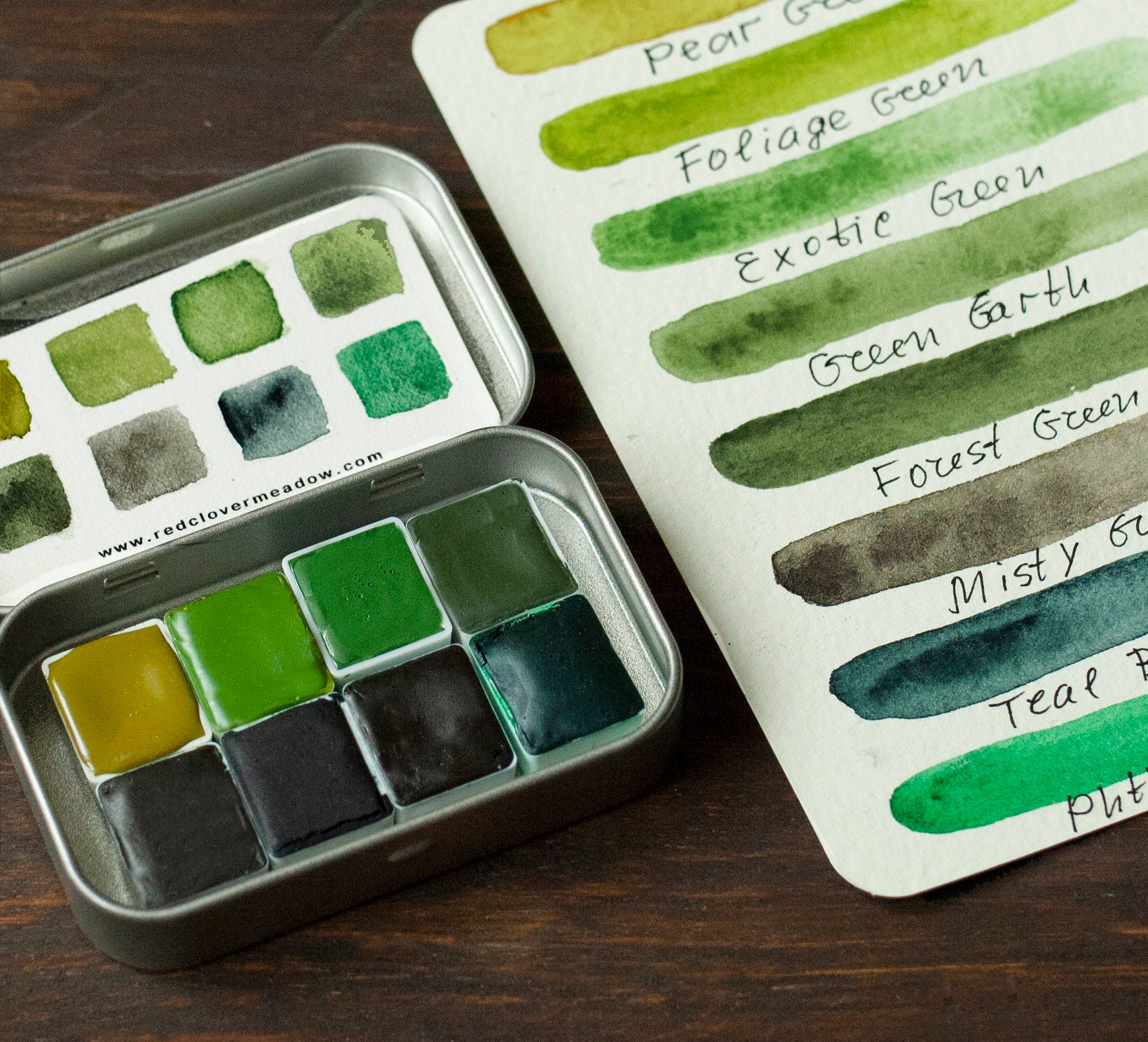 Green watercolor paint set - 8 half pans. Handmade watercolors. Watercolor supplies. Watercolor palette.