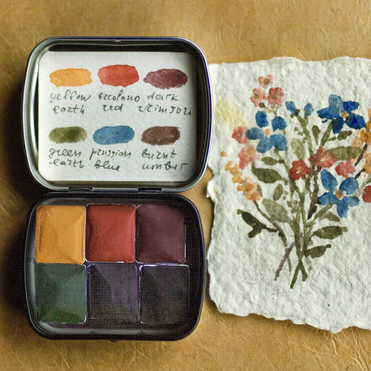 This mini travel palette is a special collection of six artisan handcrafted eco-friendly watercolors. It is a handmade watercolor set of six individually wrapped half pans in a black metal tin.