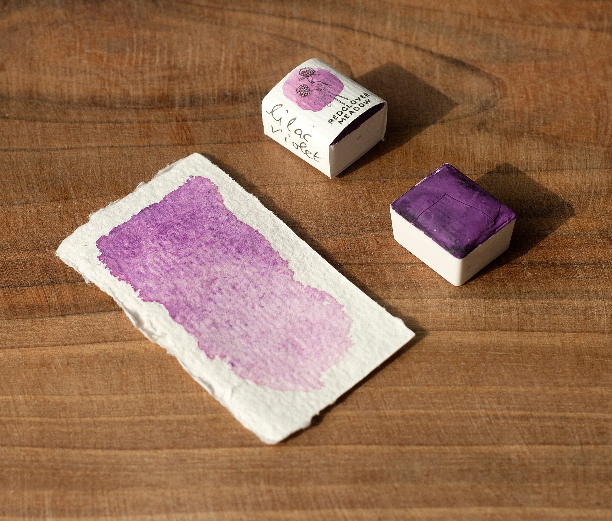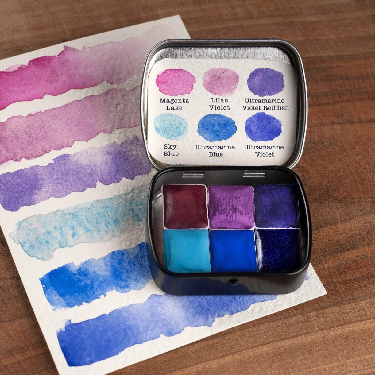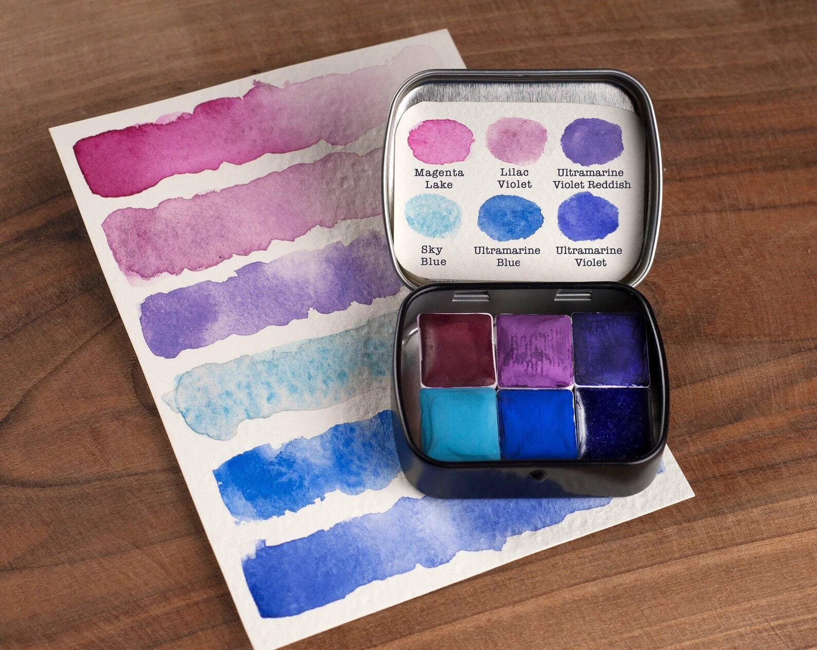 This palette blue-violet is a special selection of six violet and blue handcrafted eco-friendly watercolors. It is a handmade watercolor set of six individually wrapped half pans in a metal tin.
